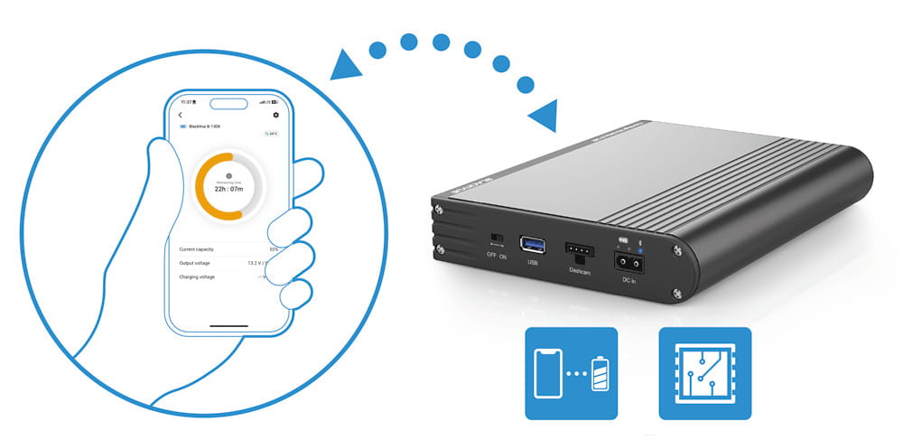 Za pomocą aplikacji mobilnej BlackVue, przy wykorzystaniu funkcji Bluetooth, istnieje możliwość monitorowania bieżącego poziomu naładowania baterii, sprawdzenia przewidywanego czasu pozostałego do jej pełnego naładowania lub rozładowania, a także odczytania parametrów związanych z poborem prądu oraz napięciem zasilającym. Informacje prezentowane są na wyświetlaczu telefonu w formie czytelnego dla użytkownika diagramu.