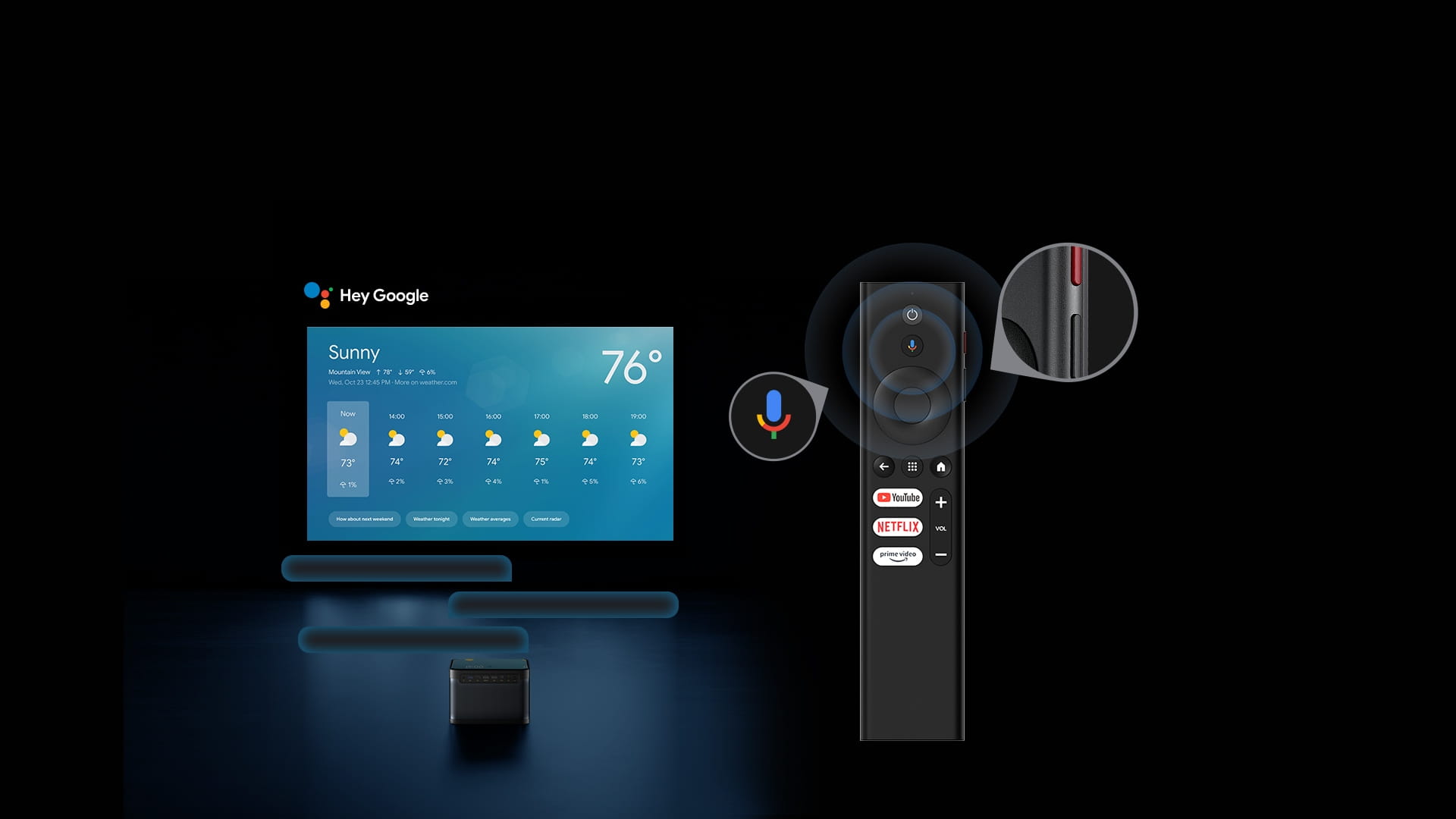 Ciesz się łatwą kontrolą. Dangbei DBOX02 jest wyposażony w poręczny pilot z dedykowanymi klawiszami skrótu do autofokusa, Sterowanie głosowe Asystenta Google i nie tylko.