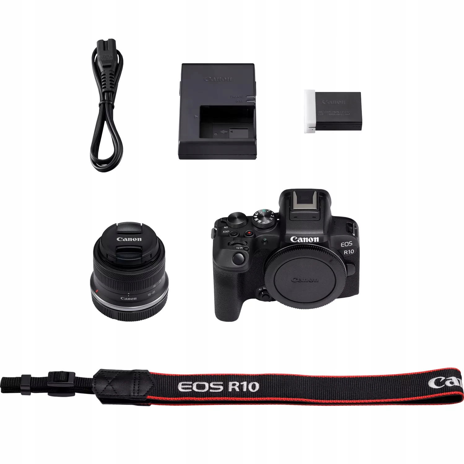 | Wyposażenie | Korpus aparatu EOS R10, Dekiel na korpus R-F-5, Pasek ER-EOS R10, Ładowarka LC-E17E, Akumulator LP-E17, Osłona akumulatora, Przewód zasilający, Zestaw instrukcji obsługi |