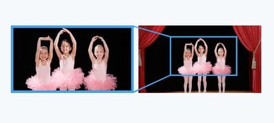 Wysoka rozdzielczość obrazu 4K pozwala wybrać fragment ujęcia do odtworzenia w rozdzielczości Full HD. Rozmiar wykadrowanej części można zmieniać dźwignią zoomu lub za pomocą ikony ekranowej.