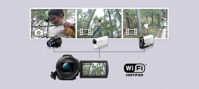 Więcej ujęć to więcej możliwości przy montażu. Teraz możliwe jest równoczesne nagrywanie z różnych perspektyw, z wykorzystaniem kamery podłączonej bezpośrednio do kamery Handycam lub sterowanej bezprzewodowo. Funkcja sterowania wieloma kamerami pozwala z łatwością zsynchronizować ustawienia zgodnych urządzeń z łącznością Wi-Fi.