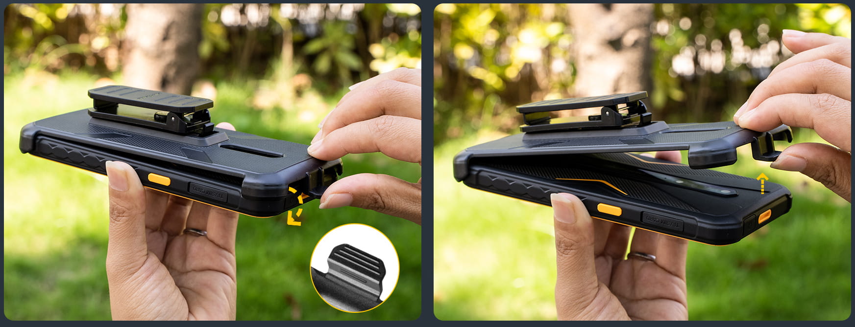 Etui możesz dostosować do indywidualnych potrzeb. Wybierz obracający się o 180° klips lub solidny karabińczyk. Możesz dodać te elementy do etui ochronnego, aby mieć telefon zawsze pod ręką, bez konieczności noszenia go w kieszeni.