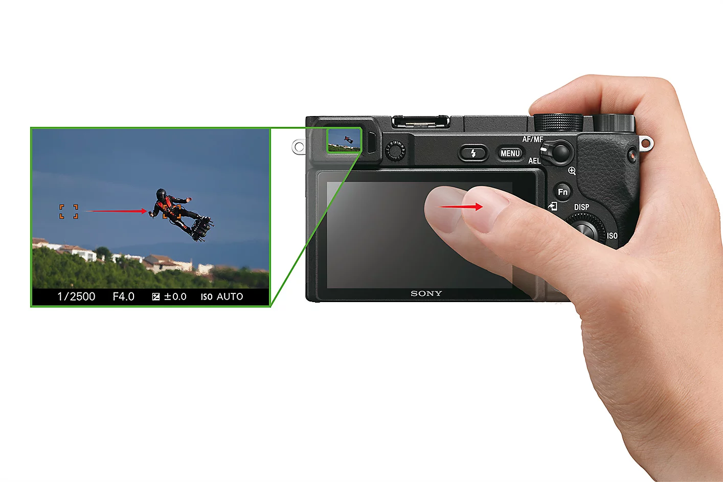 Funkcja panelu dotykowego umożliwia płynną zmianę punktu skupienia ostrości podczas patrzenia przez wizjer. Po prostu przesuń palcem po ekranie do miejsca, w którym chcesz utrzymać ostrość.