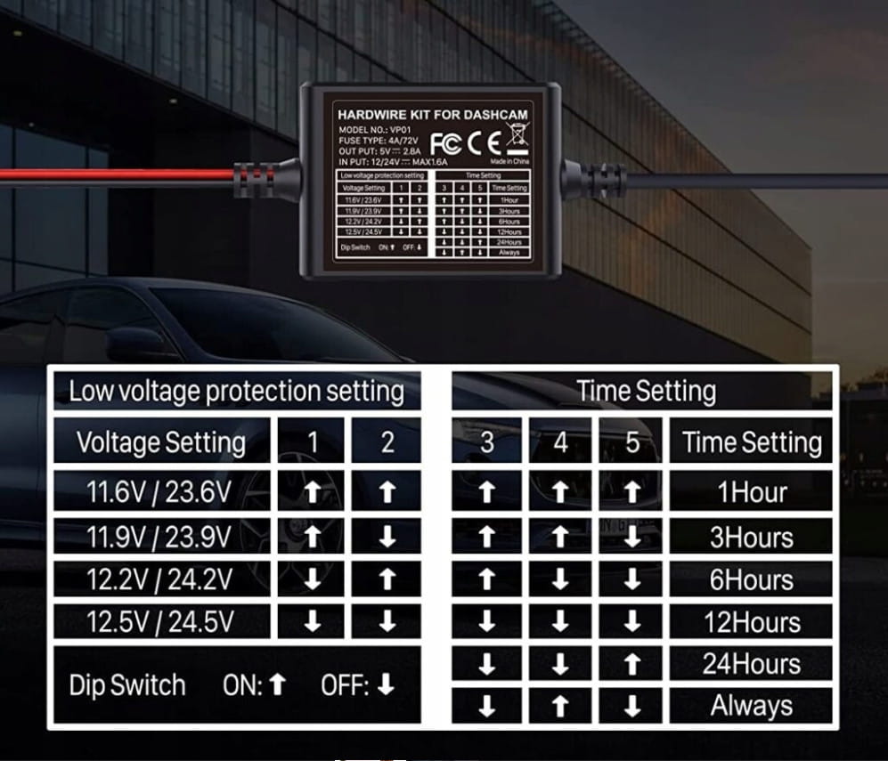 Możemy również ustawić czasowe odcięcie aby po 2 / 4 / 6 / 12 / 24 godzinach adapter wyłączył zasilanie do kamery samochodowej.