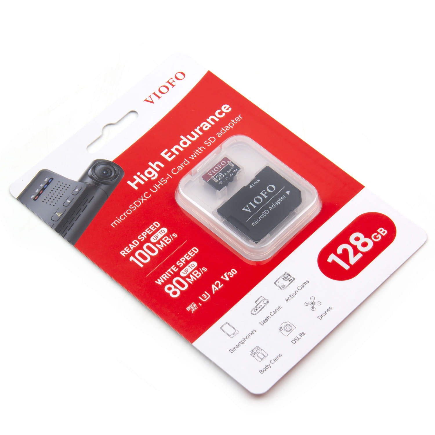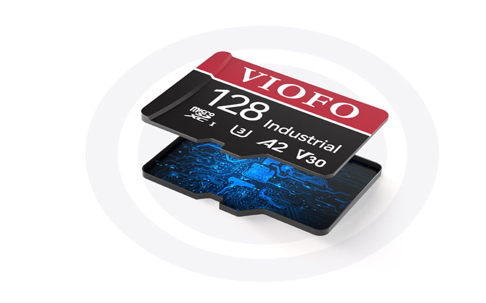 Wysokiej jakości układy chipowe zapewniają wysoką wydajność U3, A2, V30 w kartach pamięci microSDXC firmy VIOFO. Rozszerzają pojemność urządzeń. Zapisują z prędkością do 80 MB/s, obsługując wideo 4K, Ultra HD, 3D oraz tryb zdjęć seryjnych.