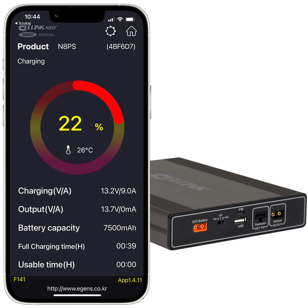 Cellink NEO 8+S został wyposażony w moduł bluetooth, który umożliwia połączenie ze smartfonem. Stworzona darmowa aplikacja IOS, Android pozwala monitorować poziom naładowania, prąd i napięcie ładowania, prąd i napięcie rozładowania, czas pozostały do pełnego naładowania / rozładowania oraz regulować prąd ładowania.
