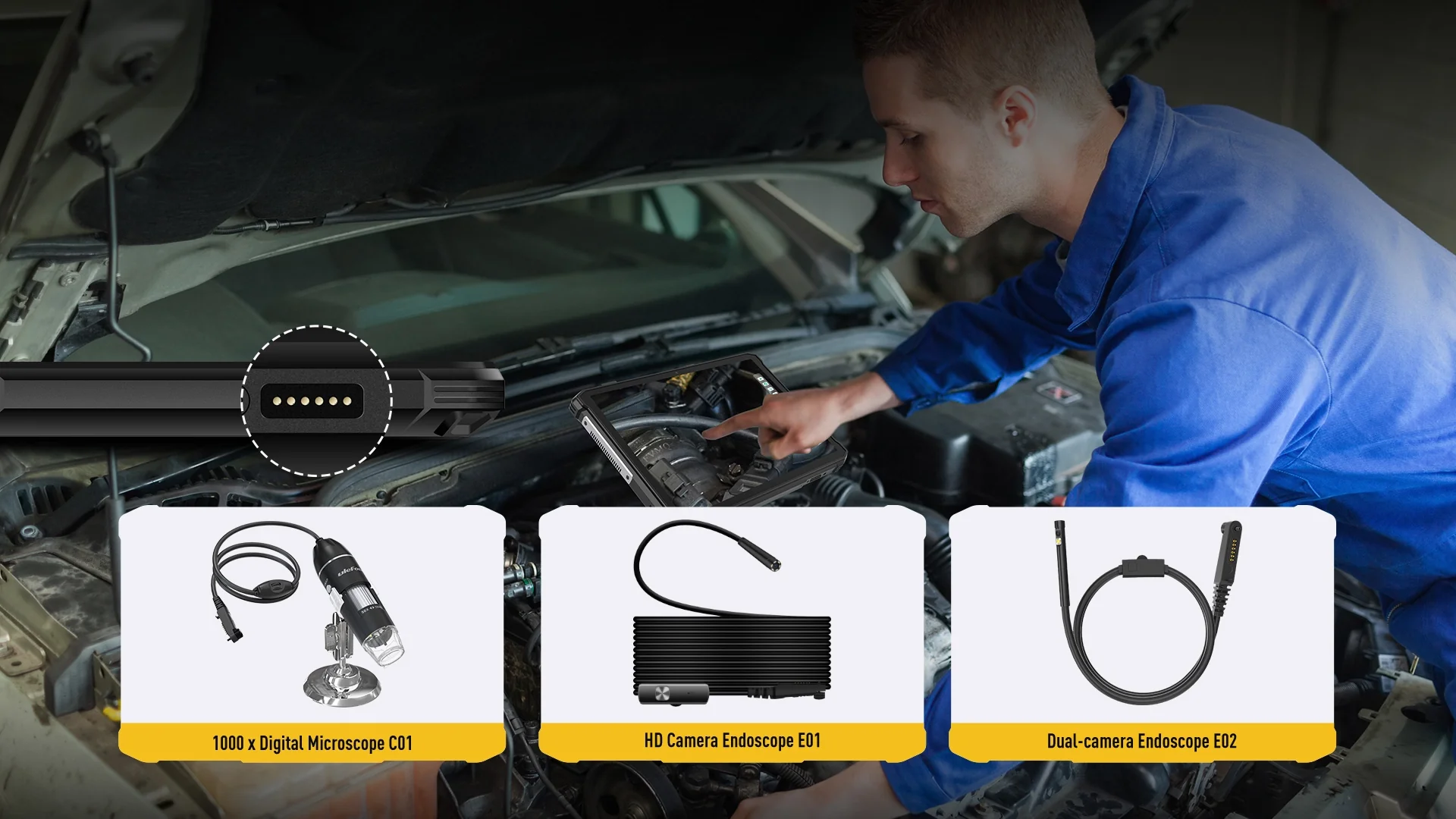 Ekskluzywne złącze rozszerzeń umożliwia korzystanie z wielu akcesoriów z serii uSmart, takich jak endoskop uSmart E02&E01 i mikroskop uSmart C01. Jego bezpieczne i niezawodne połączenie zwiększa wydajność pracy podczas konserwacji pojazdów, kontroli rur itp.
