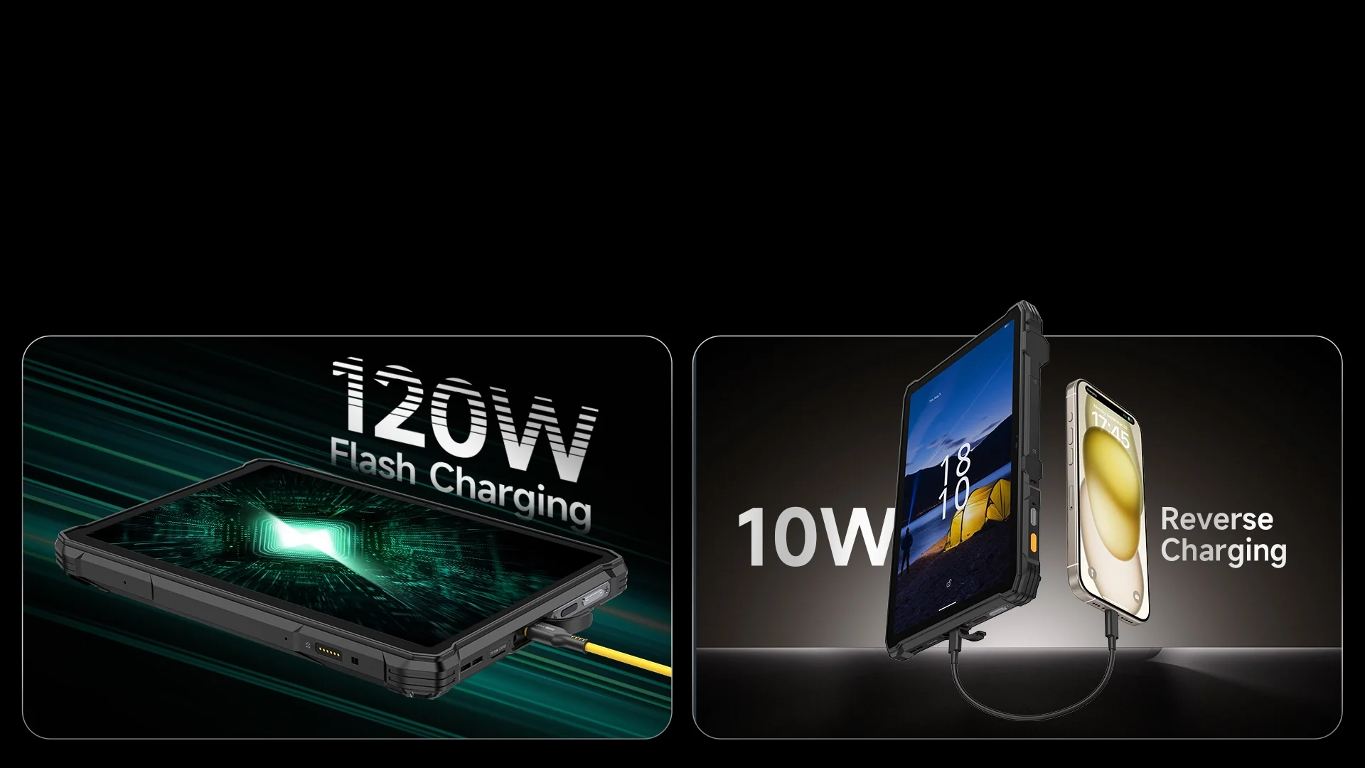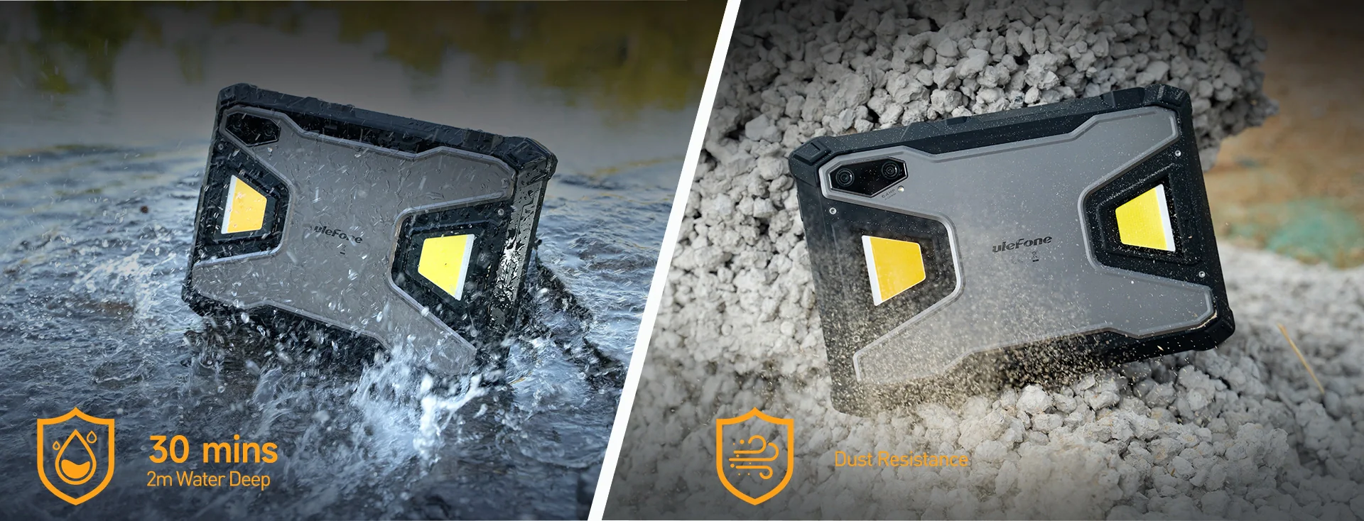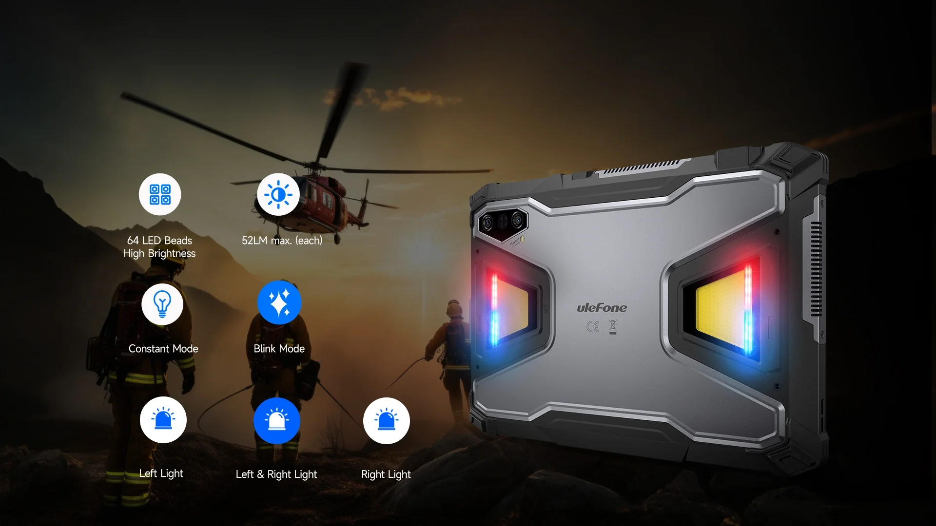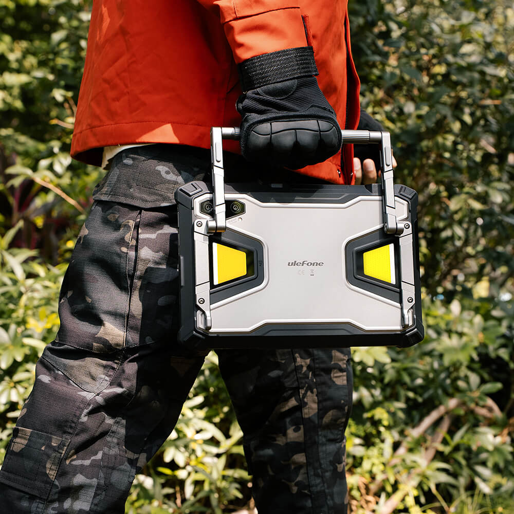 Armor Pad 5 Pro to nie tylko wytrzymały tablet, ale także potężna, przenośna, wielofunkcyjna lampa LED. Dzięki 377 diodom LED zapewniającym 1000 lumenów (w każdej z dwóch lamp) można przełączać się między ciepłym a białym światłem, dostosowując je do każdej sytuacji. Dzięki wydajnej baterii o pojemności 24 200 mAh lampa charakteryzuje się długą żywotnością. W sytuacjach awaryjnych wystarczy włączyć tryb migania, aby być widocznym. Idealnie nadaje się na biwak lub do użytku w warsztacie i garażu.