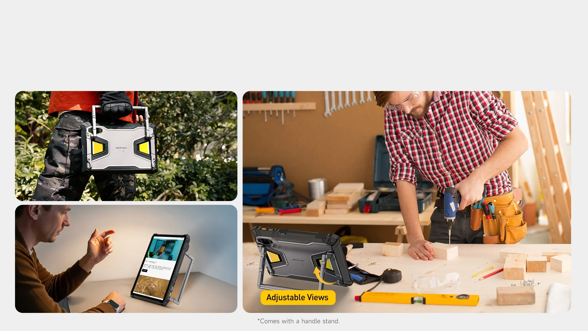 Uchwyt do Armor Pad 5 Pro jest wykonany z wytrzymałego stopu metalu. Zaprojektowano go z myślą o łatwej obsłudze jedną ręką oraz bezpiecznym przenoszeniu urządzenia, nawet w trudnych warunkach. Można go też szybko rozłożyć, aby uzyskać stabilną podstawkę. Dzięki temu możesz wygodnie pisać, prowadzić wideokonferencje i przeprowadzać kontrole, ciesząc się stabilnym widokiem pod dowolnym kątem.