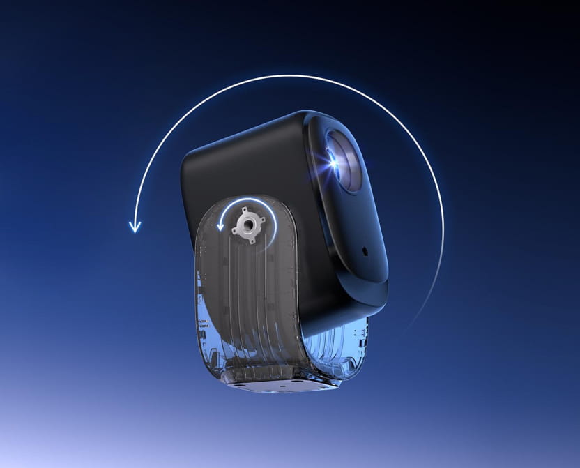 Brak nieporęcznych adapterów dzięki wbudowanej płycie zasilającej, co upraszcza konfigurację i zwiększa mobilność. Port zasilania umieszczony na dole, przy podstawie gimbala, obraca się bez zakłóceń razem z projektorem, zapewniając brak ograniczeń związanych z kablem podczas regulacji o 190°.