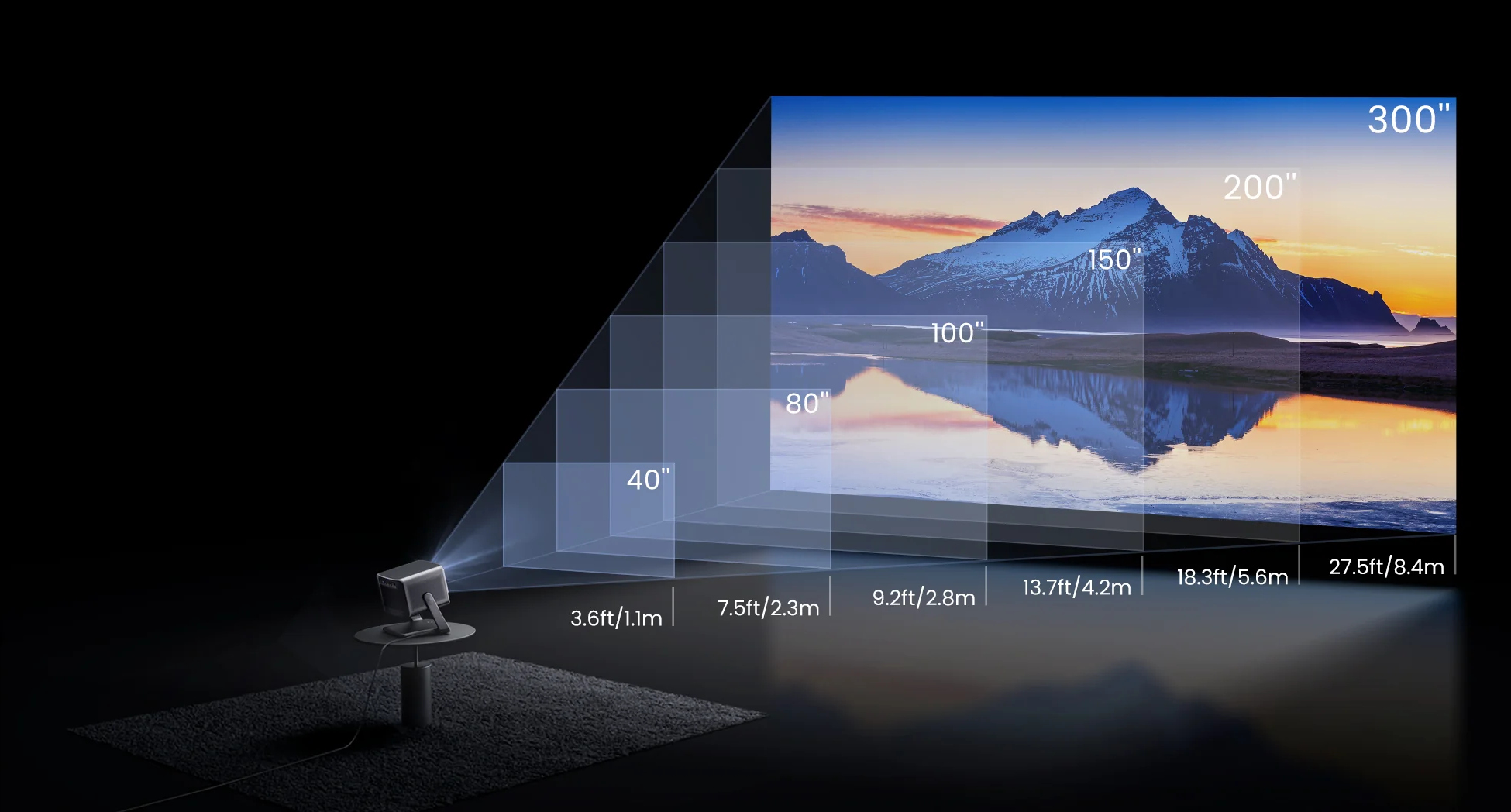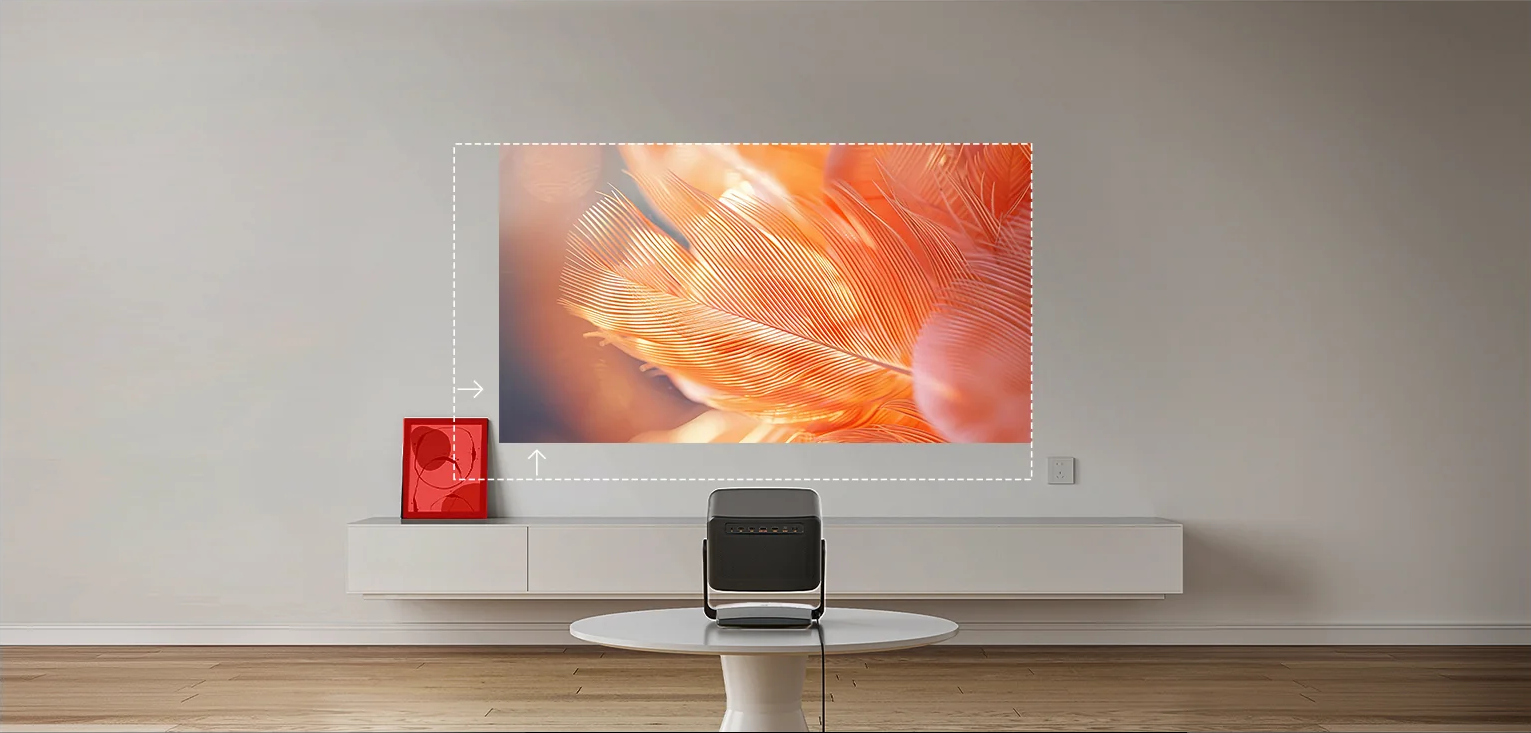 Nie wiesz, jaki rozmiar ekranu pasuje do Twojego pokoju? Mamy to wszystko zaplanowane. DBOX02 Pro zapewnia oszałamiającą jakość obrazu od 40" do 300"³. Niezależnie od tego, czy masz przytulny kącik, czy przestronny salon, wystarczy dopasować rozmiar pokoju do przewodnika projekcji, aby znaleźć idealne ustawienie w każdej przestrzeni.