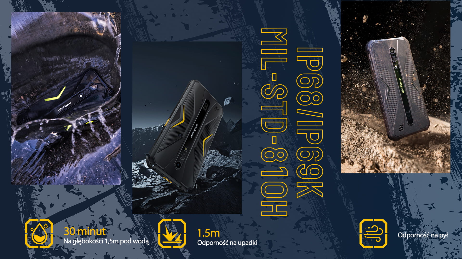 Armor X12 Pro spełnia normy IP68/IP69K oraz MIL-STD-810H. Oznacza to, że może wytrzymać wiele ekstremalnych wyzwań, w tym kurz, upadki, wodę, skrajne temperatury i wysoką wilgotność. Został zbudowany, aby przetrwać w trudnych warunkach, dzięki czemu idealnie nadaje się do pracy na placach budowy, ale także do sportów wodnych, wspinaczki i leśnych wędrówek.