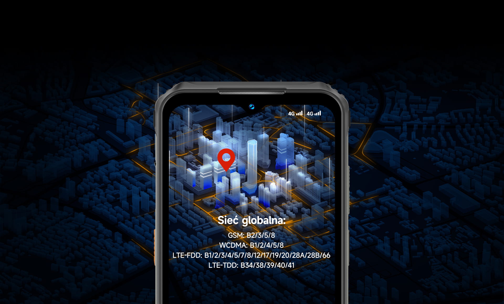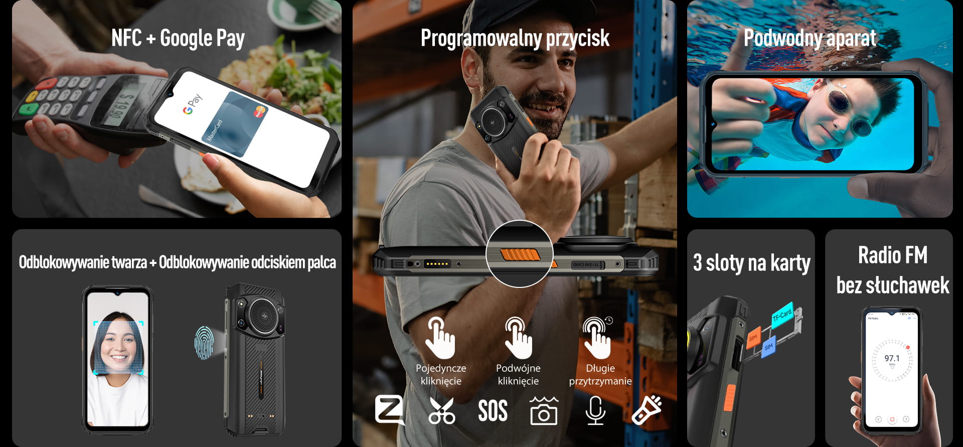 Spełniając normy certyfikacji IP68, IP69K oraz MIL-STD-810H, ten wytrzymały telefon może przetrwać zanurzenie w wodzie na 1,5 m, wysokie ciśnienie, kurz, upadki, uderzenia i ekstremalne temperatury. Jest to doskonały wybór dla pracowników budowlanych, poszukiwaczy przygód, alpinistów, górników i innych miłośników aktywności na świeżym powietrzu.