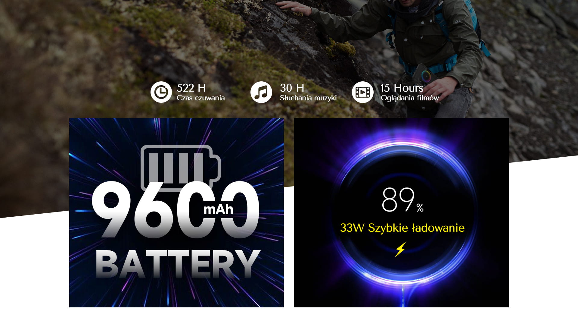 Super duża bateria 9600 mAh pozwala zanurzyć się w Internecie, słuchać muzyki, oglądać filmy i grać w gry przez wiele godzin bez ładowania. Ponadto Armor 21 obsługuje ładowanie zwrotne, dzięki czemu możesz naładować swój smartwatch lub słuchawki w sytuacji awaryjnej.